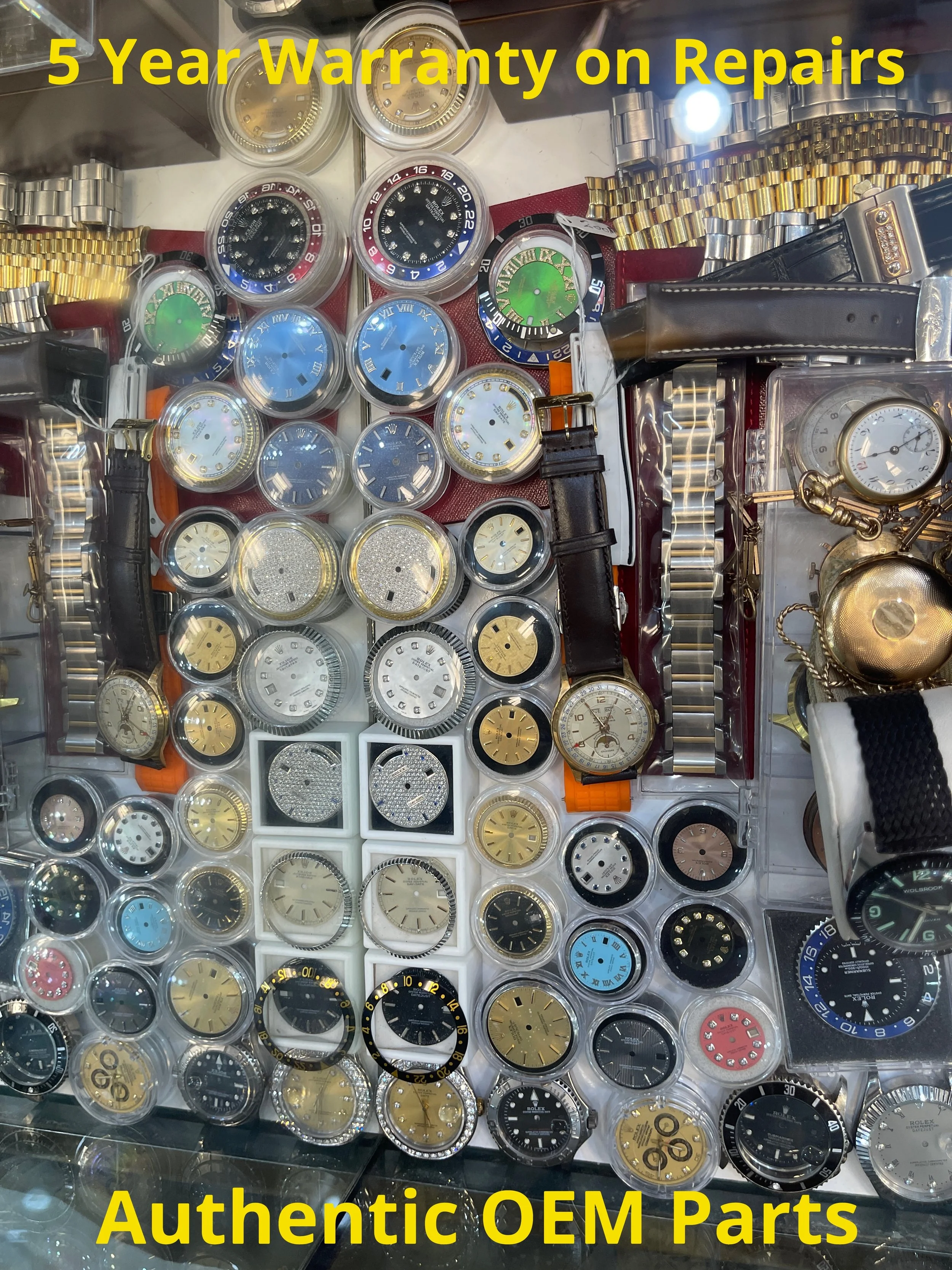 The Watchmaker I use for all my repairs has been certified for over 35 years of repairs on all types of watches. No Repair or Service is too Big or too Small - He knows his work is 100% and offers 5 year warranty on all his work. He has worked in Germany as a Watchmaker, has worked in the high end luxury stores here in Las Vegas for many years and now is independent. You will know he is very experienced and uses only Authenic OEM parts only on all watches.